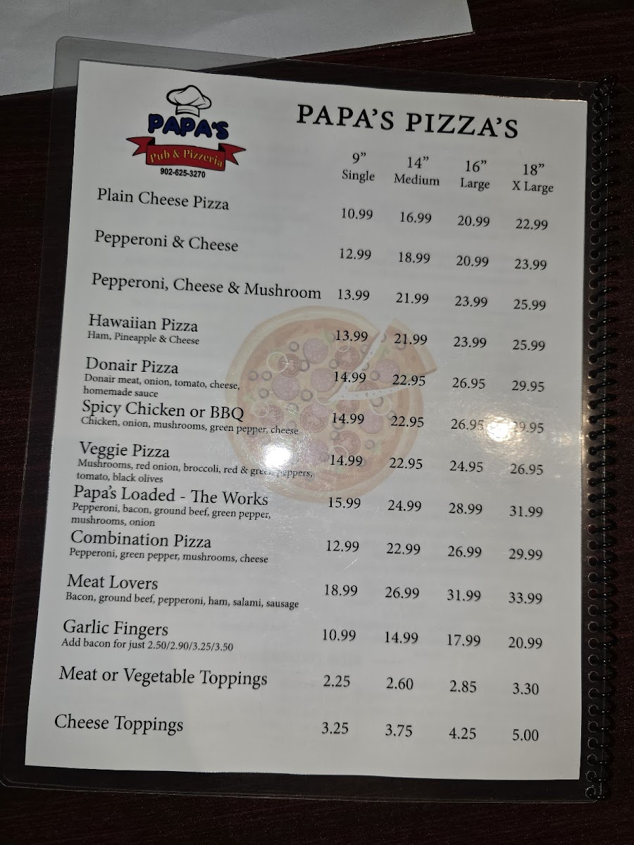 If you're seeking a delicious culinary adventure in Port Hawkesbury, look no further than Papa's Pub & Eatery. Located at 714 Reeves St, this welcoming establishment has quickly garnered a reputation for offering much more than just the standard pub fare. The menu boasts an impressive range of starters, including the ever-popular Donair Rolls and Deep Fried Pepperoni, both priced at $12.49, alongside flavorful offerings such as Chicken Wings for $15.49 and the unique Messy Donair Fry Bake at $16.49.